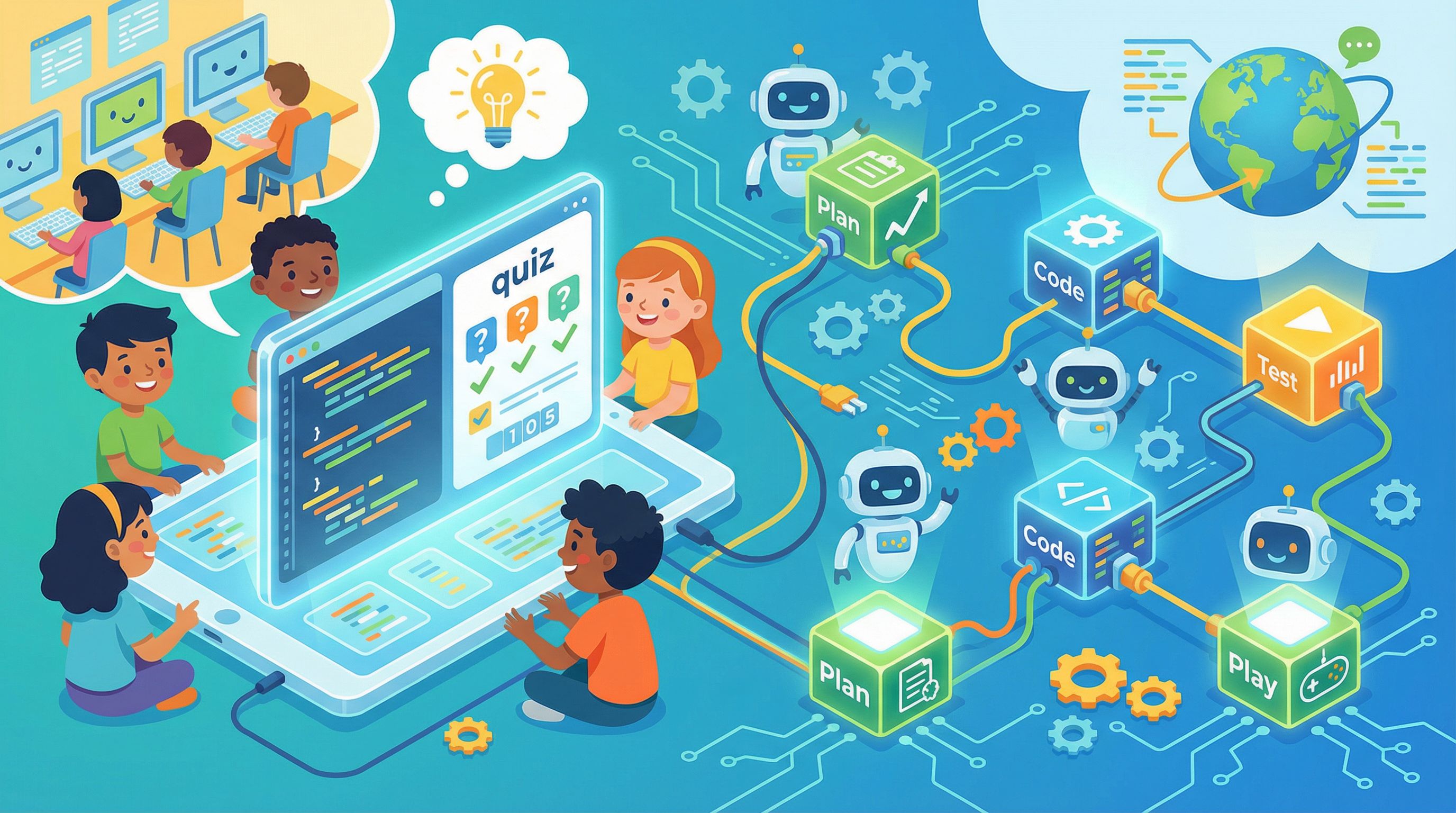 A multiplayer version where two players take turns and compare scores. A themed quiz with custom CSS, dark mode, neon colors, pixel art fonts. One kid built a "quiz creator" where you type in your own questions through a form, and the app generates the quiz for you.