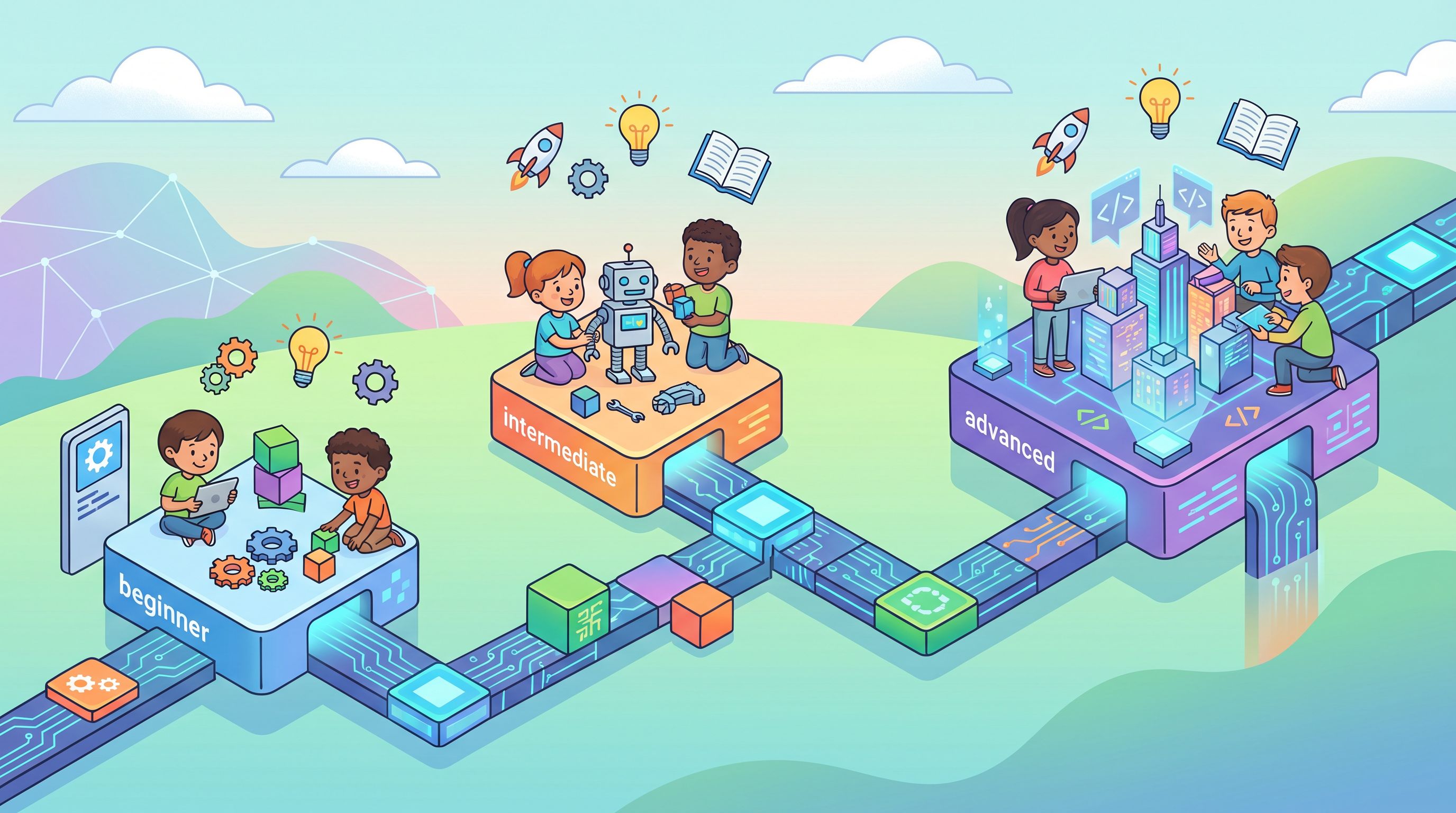 Working with external data, advanced game features, or introductory AI. Kids shift from following instructions to inventing their own solutions.