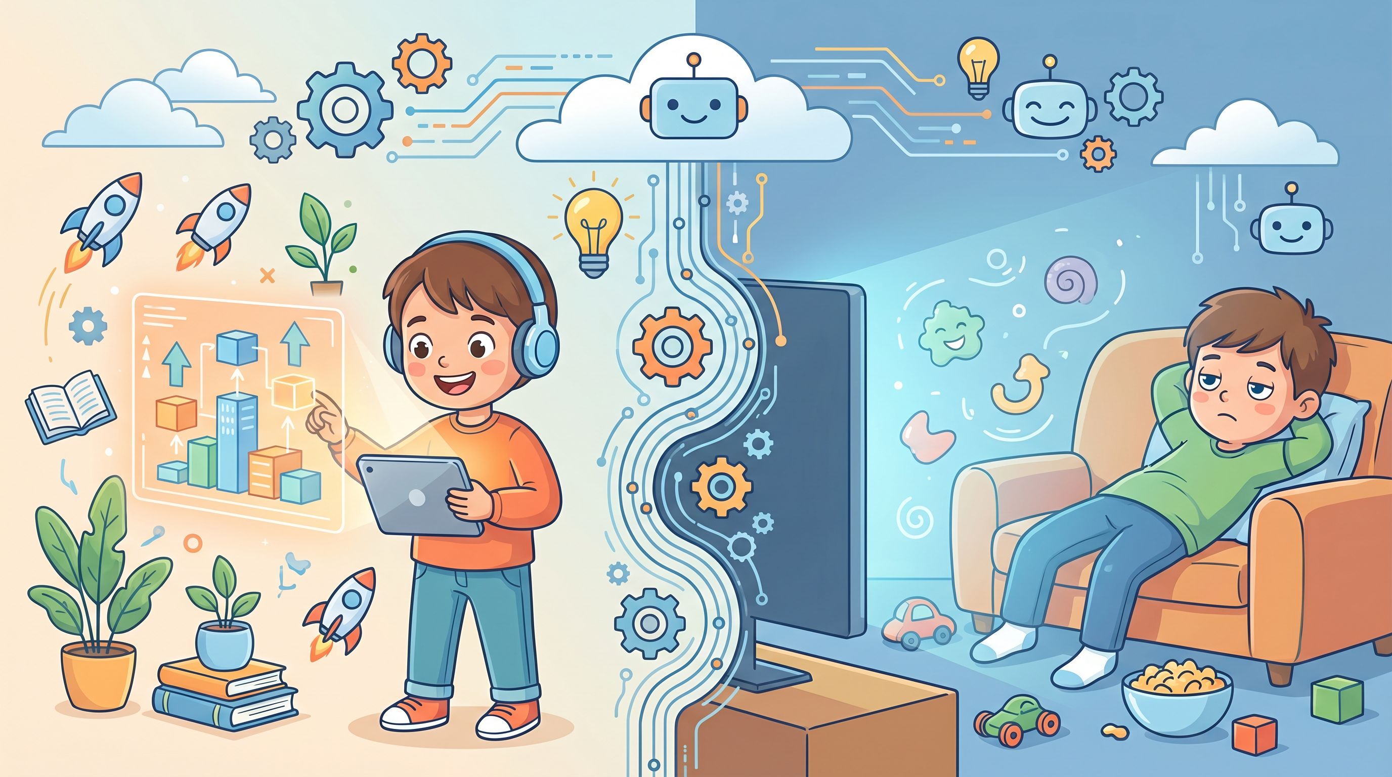 Passive screen time is exactly what it sounds like: your kid is receiving content without doing much with it. Scrolling a social media feed, watching random YouTube videos, binge-watching a show. The brain stays at a surface level — enough to keep watching, not enough to actually grow.