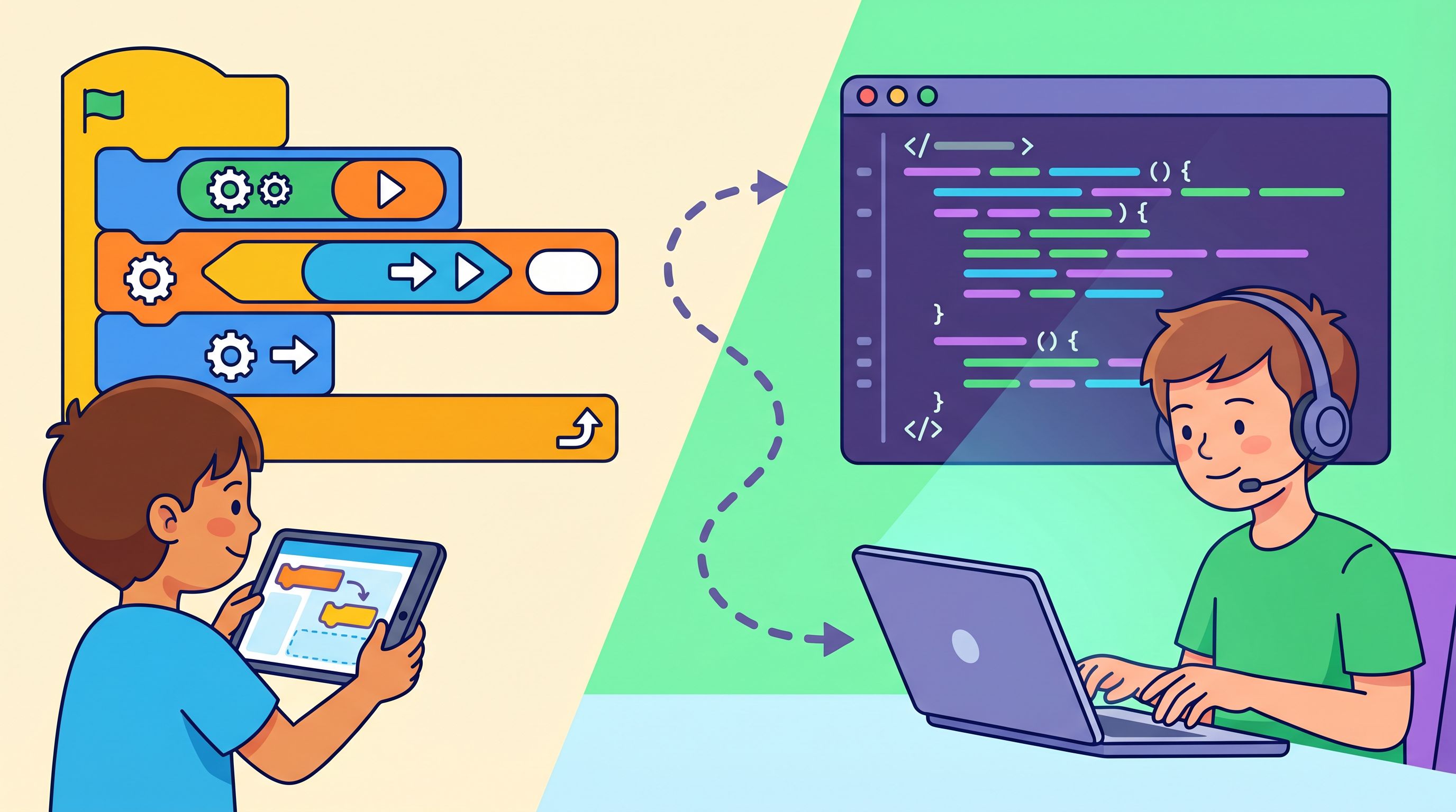 Your kid has been dragging and dropping colorful blocks to make a cat dance across the screen for six months. They're proud of their creations. You're proud too. But one question keeps coming up: is this real coding? And when should they move on from snapping blocks to typing real code?